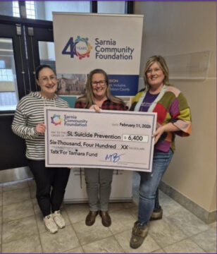 The Sarnia Lambton Suicide Prevention Committee is beyond thrilled to be on the receiving end of an incredibly generous donation from TFT – Talk for Tamara. The $12,300.00 donation comes at an ideal time after our committee was denied funding by United Way for the second consecutive year. These much needed funds will be used to promote awareness, build capacity around safeTALK and ASIST Training, bolster Suicide Prevention and Intervention training in the Sarnia Lambton community. The committee also plans to host a Youth Forum to hear directly from Youth, what they feel it is important adults know about what is helpful when they are struggling and what else they would like to see offered in our community. TFT’s donation will also sponsor an entire session of Survivor Support Grief Group. We are both humbled by and grateful for Lori Lumley and her TFT team’s unwavering support.